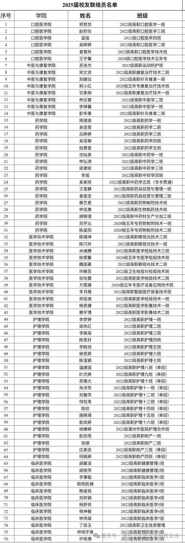 为进一步提升校友服务质量,构建高效互通的联络体系,推动校友之间资源共享、协同发展,深化校友与母校的情感纽带,漳州卫生职业学院校友会组织开展2025届毕业生校友联络员聘任工作。经个人踊跃自荐、班级积极推荐,结合各学院初审与校友会综合评审,最终确定聘任甘家炯等76名优秀毕业生担任校友联络员。