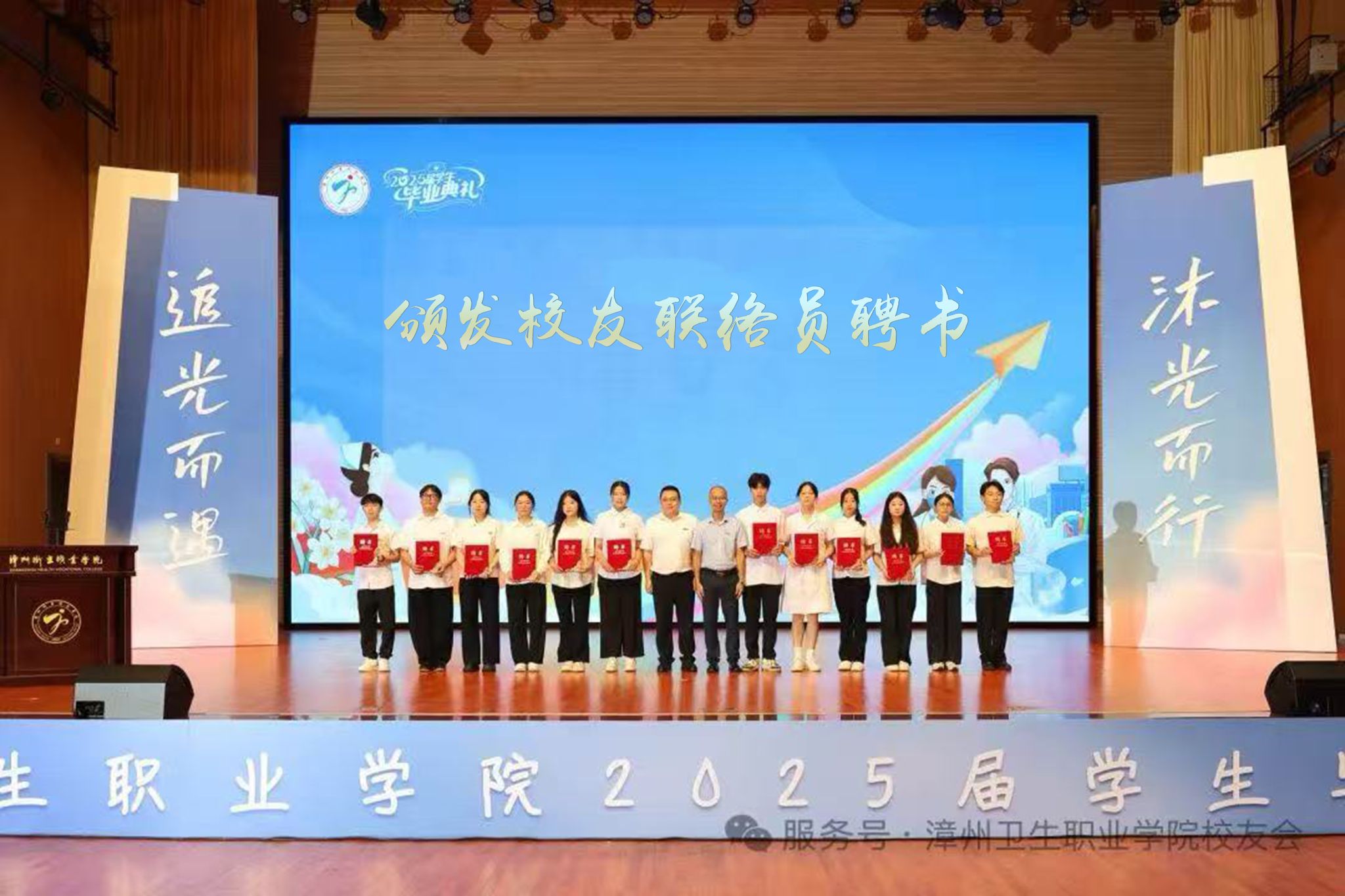 在2025届学生毕业典礼上,学校领导为联络员颁发“漳州卫生职业学院校友联络员”聘书,进一步加深了学校与毕业生之间的联系和感情。