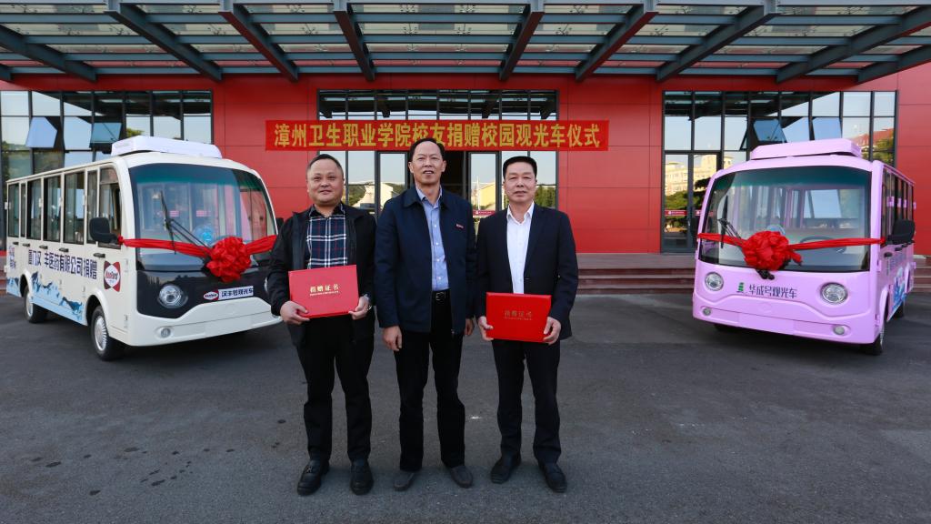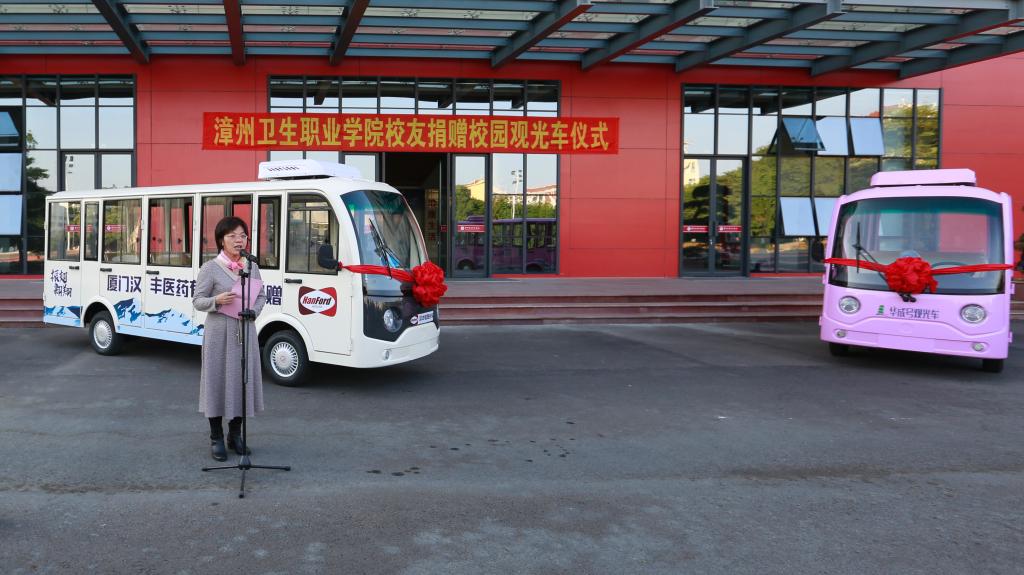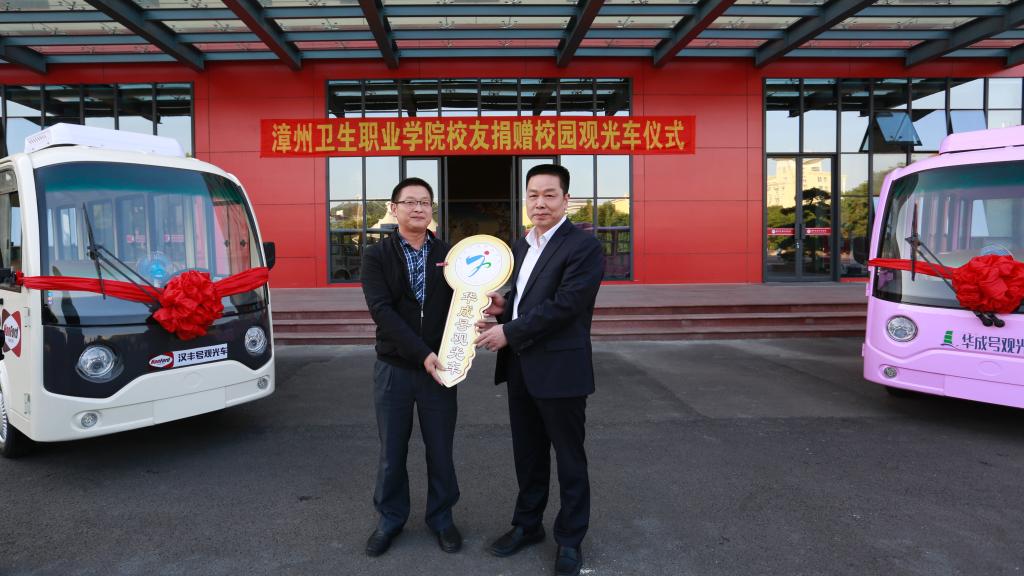 12月8日下午,我院87届中药剂专业校友、福建省华成医药有限公司董事长陈应权和93届医士专业校友、厦门汉丰医药有限公司董事长肖汉章重返母校,向学院捐赠电瓶车2部,表达对母校的感恩之情。捐赠仪式在体育艺术中心举行,学院党委书记林忠,原漳州卫生职业学院副书记、副院长林永富,副院长沈小美、蔡韶滨,校友会理事及学生代表共百余人参加,仪式由校友会会长主持。