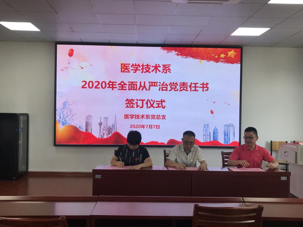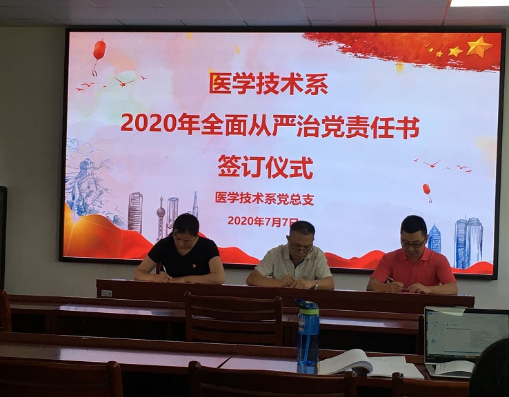 7月7日下午,医学技术系在明智楼411会议室举行2020年党建工作目标及全面从严治党责任书签订仪式。系班子成员、全体教职工参加签订仪式。系党总支副书记主持。