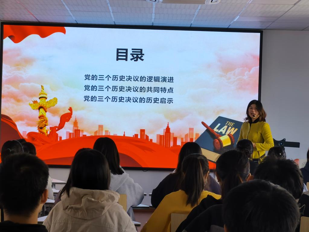 会上,郭老师围绕党的三个历史决议的逻辑演进、党的三个历史决议的共同特点、党的三个历史决议的历史启示,带领同学们全面系统的学习领会党的三个历史决议的重要精神内涵及意义,从而引领同学们深刻认识和把握全会精神的丰富内涵和核心要义。郭老师指出,党的十九届六中全会全面总结了党百年奋斗的重大成就和历史经验问题,充分体现了我们党牢记初心使命、永葆生机活力的坚强意志和坚定决心。我们要以史为鉴、开创未来,埋头苦干、勇毅前行,为实现第二个百年奋斗目标、实现中华民族伟大复兴的中国梦而不懈奋斗。