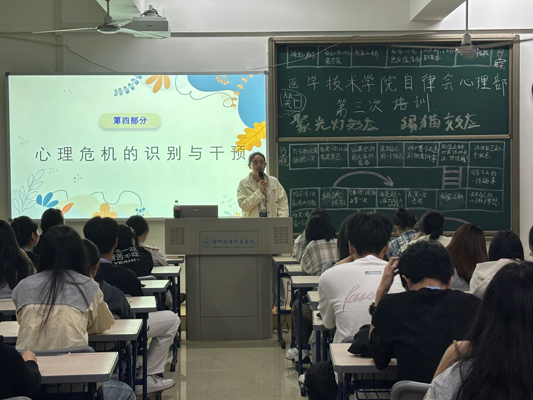 为充分发挥朋辈互助在校园心理健康教育中的作用,提升学生干部的沟通技巧与心理关怀能力,2025年10月26日-2025年11月26日,医学技术学院自律会心理部在励志楼201、一站式社区,开展了以“以心传心,护航成长”为主题的四次朋辈心理培训活动。
