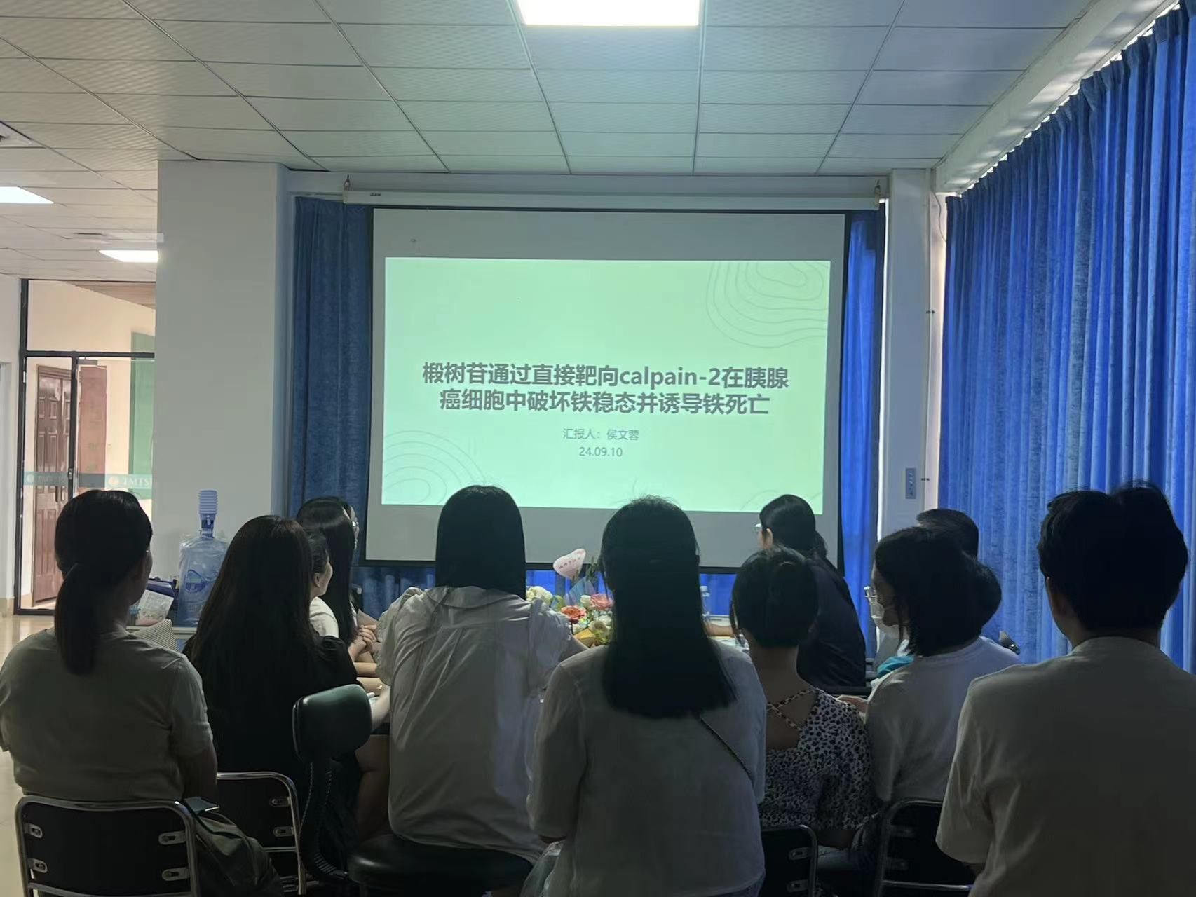 随着新学期的帷幕缓缓拉开,医学检测中心迎来了科研探索的新起点。9月10日下午,张春斌教授科研团队在该中心顺利召开了开学初的首次科研组会,为新学期的工作拉开了序幕。会上,研究生侯文蓉同学以其深厚的学术功底和敏锐的科研视角,为与会者带来了一场关于“椴树苷通过直接靶向calpain-2在胰腺癌细胞中破坏铁稳态并诱导铁死亡”的精彩文献汇报。