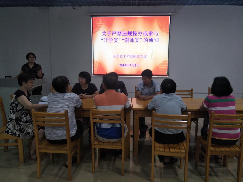7月2日医学技术系教师支部在明智楼101开展学习关于严禁违规操办或参与“升学宴”“谢师宴”的通知,由教师支部书记陈雅静主持并强调,认真学习,提高认识,切实做到令行禁止,自觉贯彻中央八项规定精神和廉洁自律各项规定。支部全体党员认真学习文件,踊跃发言,热烈互动。