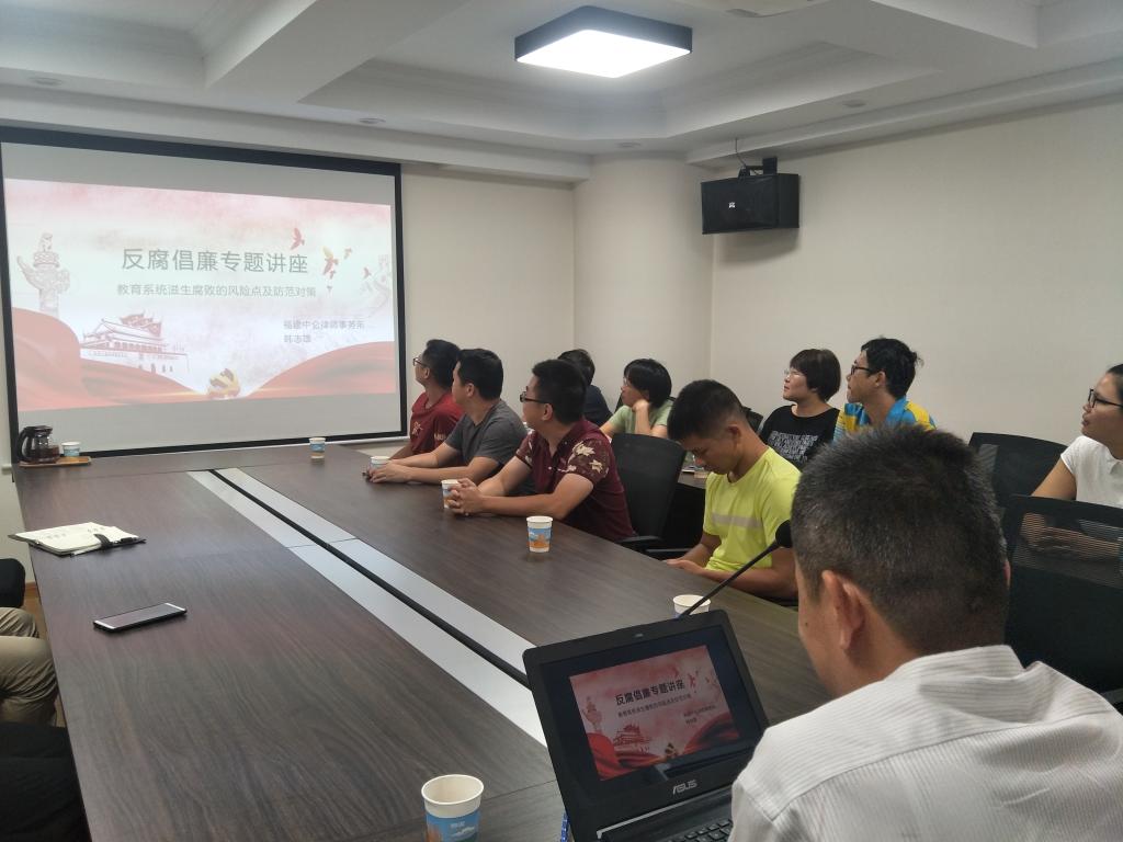 2019年10月15日,医学技术系党总支与律师协会中仑律师事务所党支部共同开展反腐倡廉专题讲座。福建中仑律师事务所韩志雄律师针对教育行业的腐败问题,开展了题为《教育系统滋生腐败的风险点及防范对策》的专题讲座。