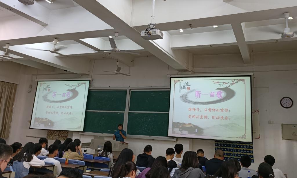 本次讲座分为忆往昔、唱感谢老师的歌、看“诚信故事”视屏、讲经典故事、诵经典诗句、谈个人感受、做诚信承诺、送吉祥祝福这八个环节展开。主持人陈老师从尊重老师、重视教育、诚实守信等角度向全体师生介绍了古人尊师重教、诚信守礼的故事,并邀请了几位同学谈自己的观后感悟,让同学们明白“国将兴,必贵师而重傅”“人与人交往在于言而有信,国与国相处讲究诚信为本”。