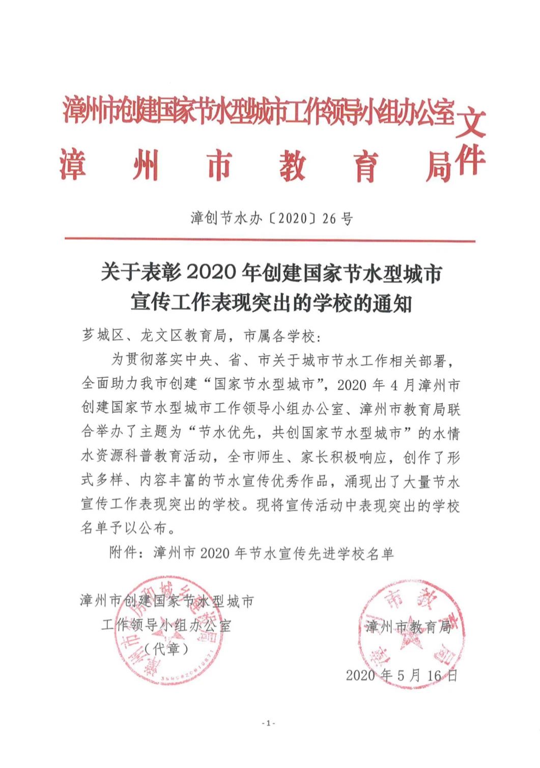 近日,我院荣获“2020年节水宣传先进学院”。据悉,2020年4月漳州市创建国家节水型城市工作领导小组办公室、漳州市教育局联合举办了主题为“节水优先,共创国家节水型城市”的水情水资源科普教育活动,共有28所学校获得“漳州市2020年节水宣传先进学校”荣誉称号。