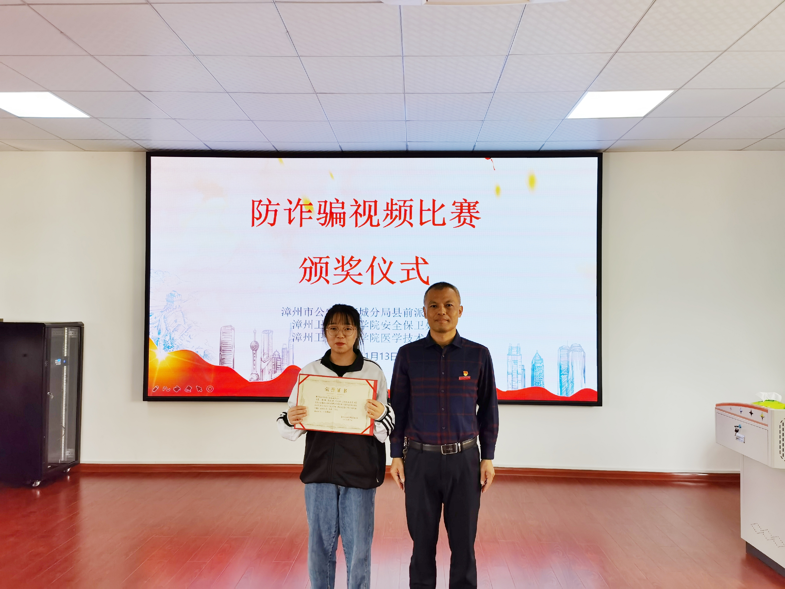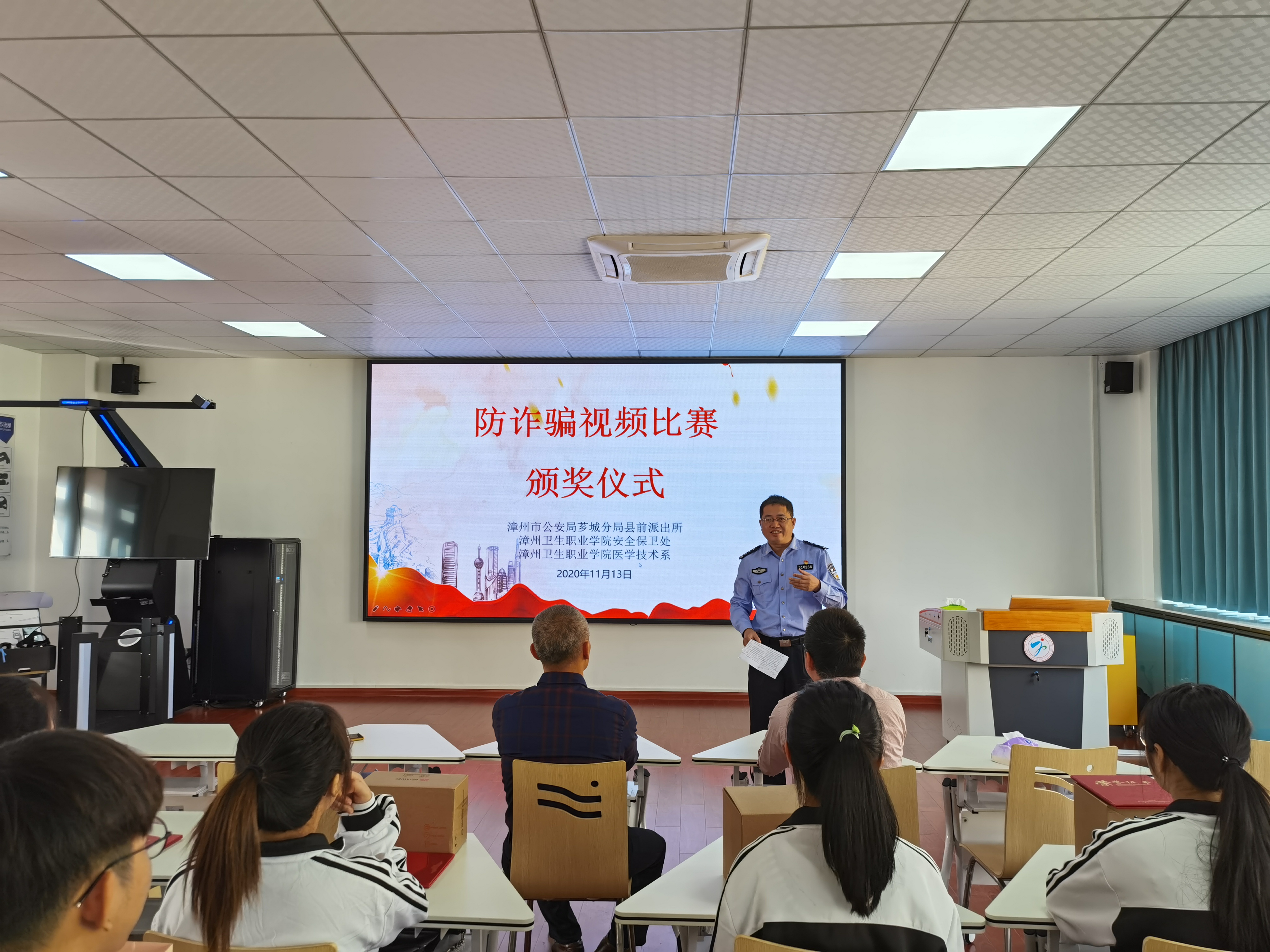 11月13日上午,医学技术系与漳州市公安局芗城分局县前派出所、学院安全保卫处联合举办以“反诈骗,懂预防,提高当代大学生的安全意识”为主题的小视频拍摄比赛颁奖仪式,在明智楼412教室举行。本次活动共收集100多件短视频,共评出8件优秀作品。