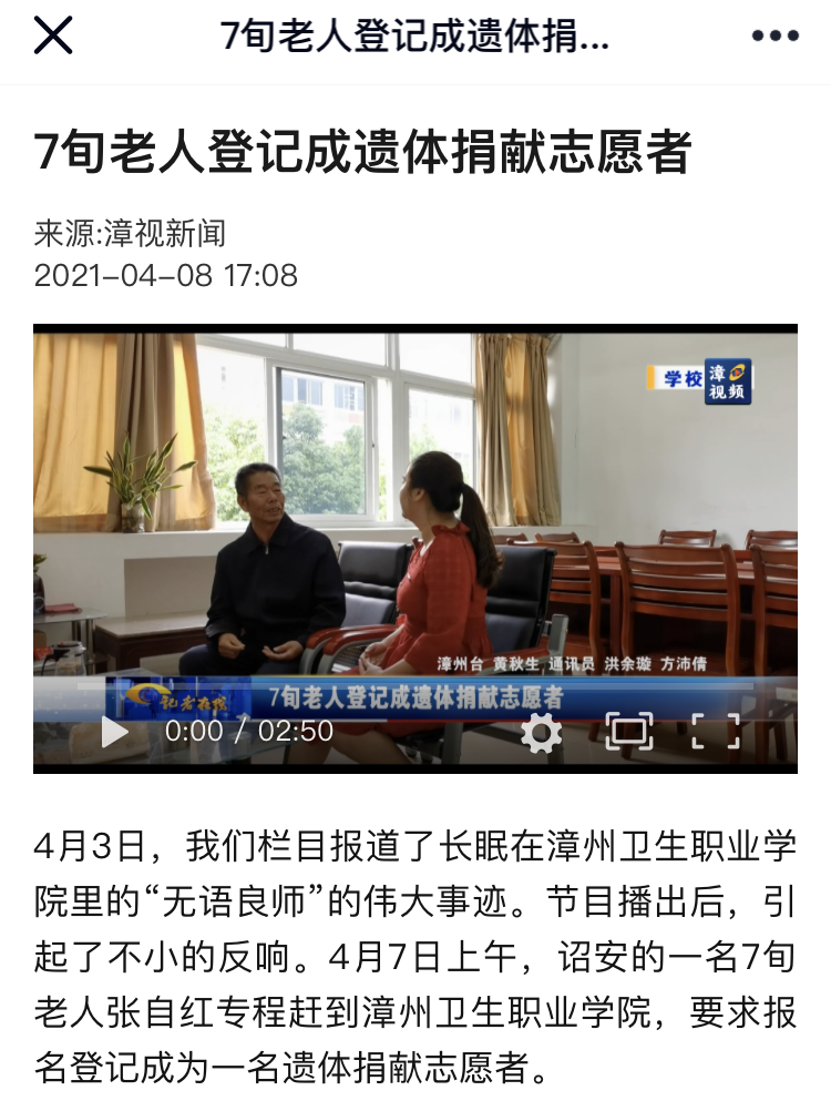 4月3日,我们栏目报道了长眠在漳州卫生职业学院里的“无语良师”的伟大事迹。节目播出后,引起了不小的反响。4月7日上午,诏安的一名7旬老人张自红专程赶到漳州卫生职业学院,要求报名登记成为一名遗体捐献志愿者。