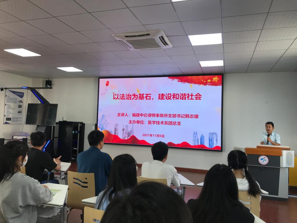 为推进高校法治宣传教育,提升高校学子法律素养,创建平安校园,11月5日上午,医学技术系团总支邀请福建中仑律师事务所党支部书记韩志雄为2021级新生开展法律知识普及教育。