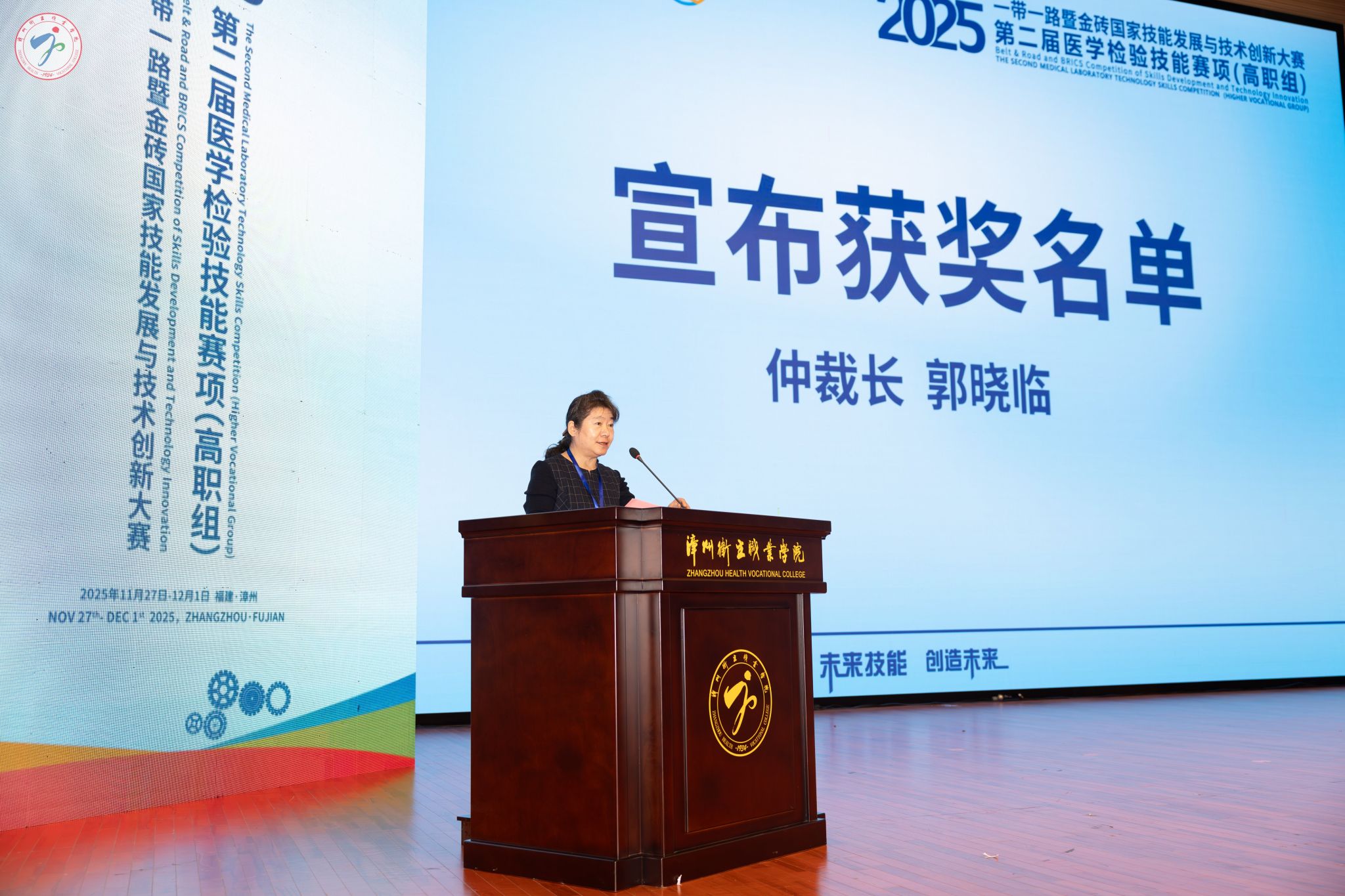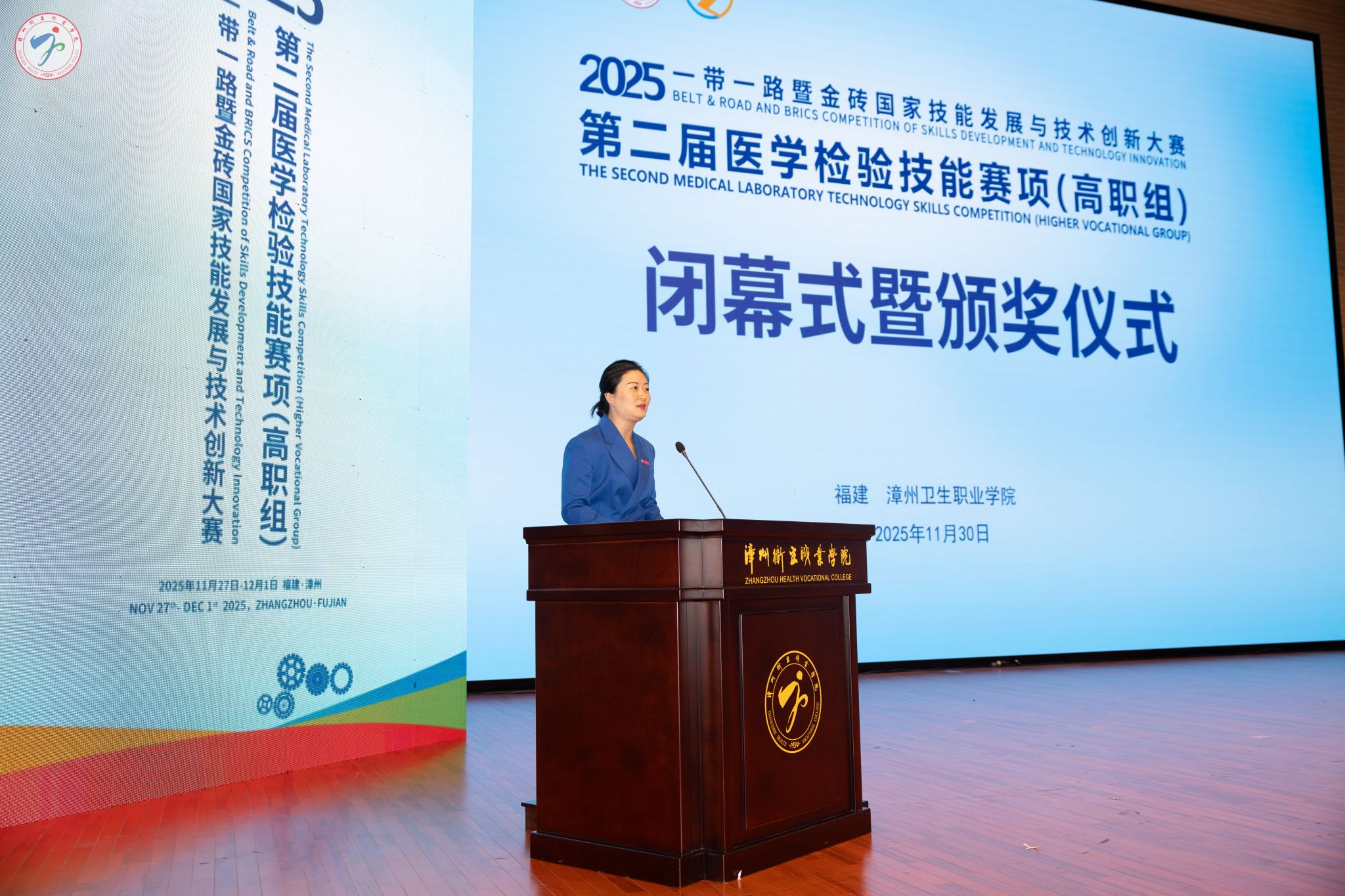 金砖国家技能发展与技术创新大赛组委会执委会国内竞赛办公室五处副处长林秋明为本次大赛致闭幕词,他对本次大赛给予了充分肯定,对医学检验技术领域的未来发展提出了殷切期望,并表示大赛将持续贯彻落实金砖国家关于技能发展与技术创新的精神,推动“金砖+”模式与“一带一路”国家深度融合,为全球技能人才培养与合作奠定坚实基础,激励全国医学检验技术领域的师生们不断追求卓越、勇攀高峰,为推动医学检验事业发展贡献积极的力量!