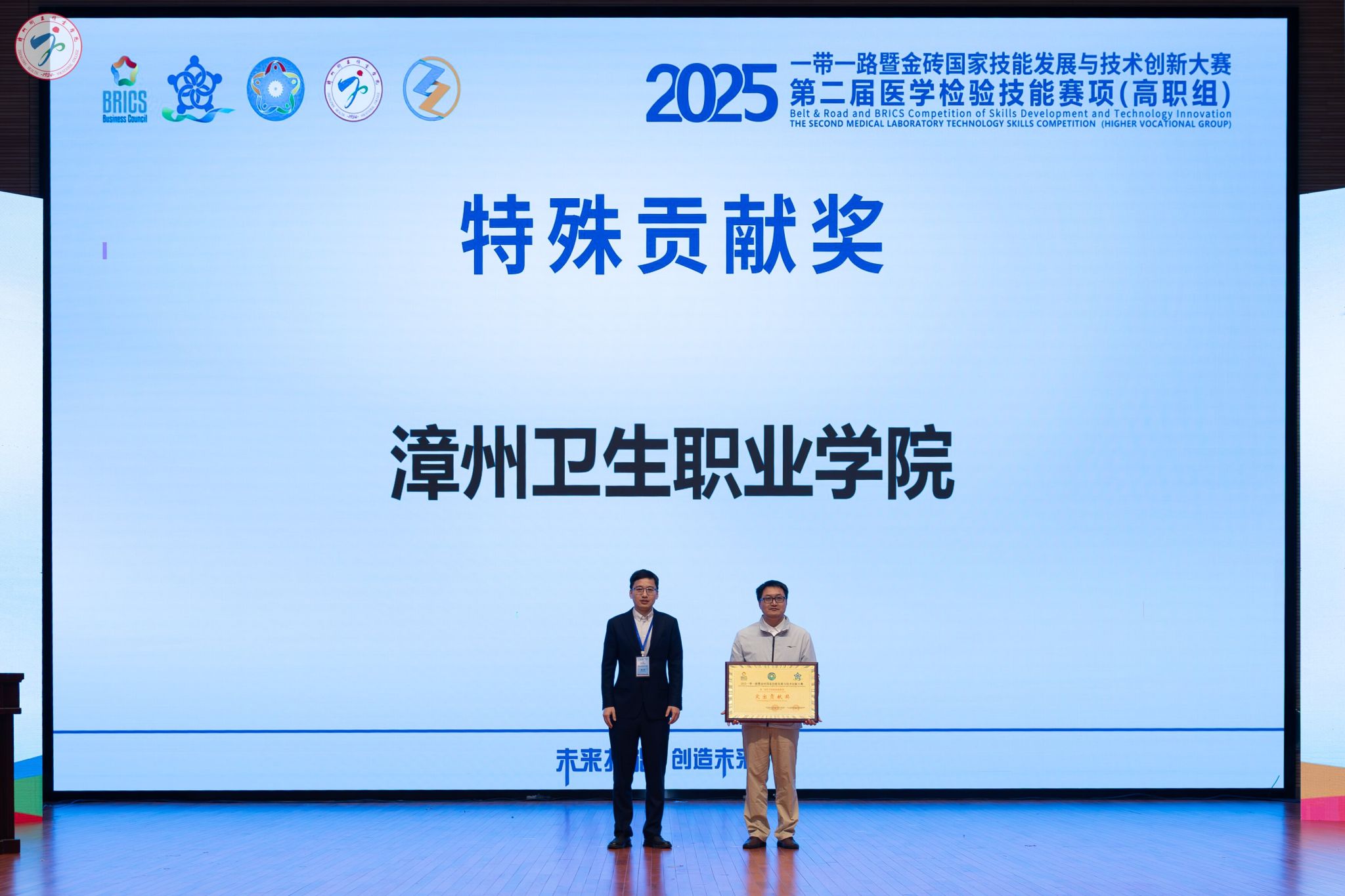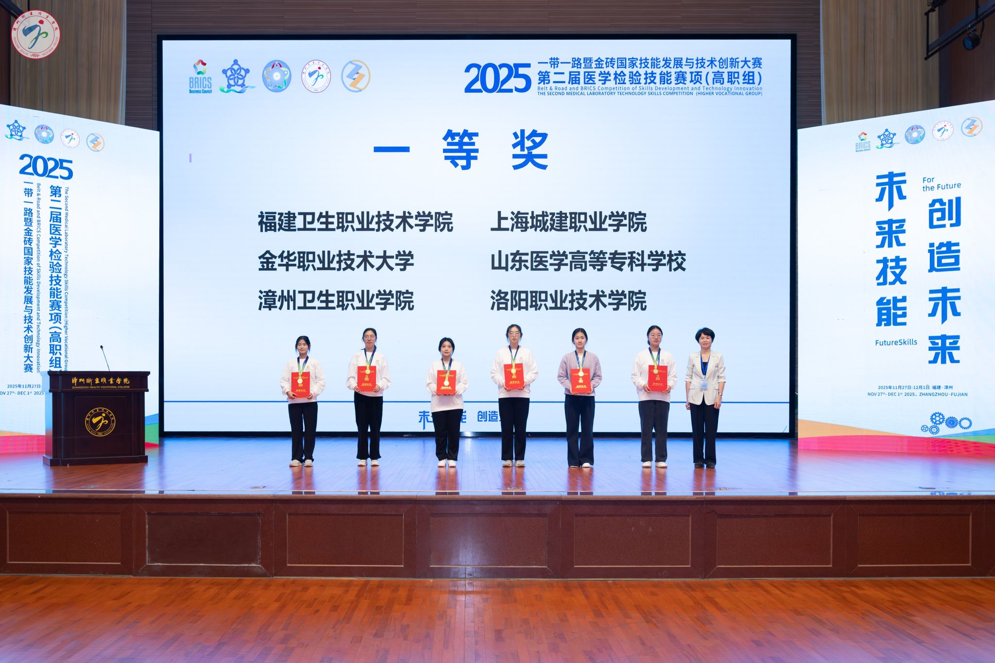 闭幕式上,赛项裁判长张纪云教授对赛事进行点评,赛项仲裁长郭晓临教授宣布了获奖名单。与会领导、专家分别为获奖选手及获奖单位颁奖。本次大赛共评选出一等奖6支队伍、二等奖12支队伍、三等奖18支队伍,及优秀组织奖、最佳组织奖和突出贡献奖。其中,福建卫生职业技术学院、金华职业技术大学获国内赛项前两名,取得2026年国际赛优先参赛资格;我校凭借出色的赛事组织与服务工作,荣获“突出贡献奖”。