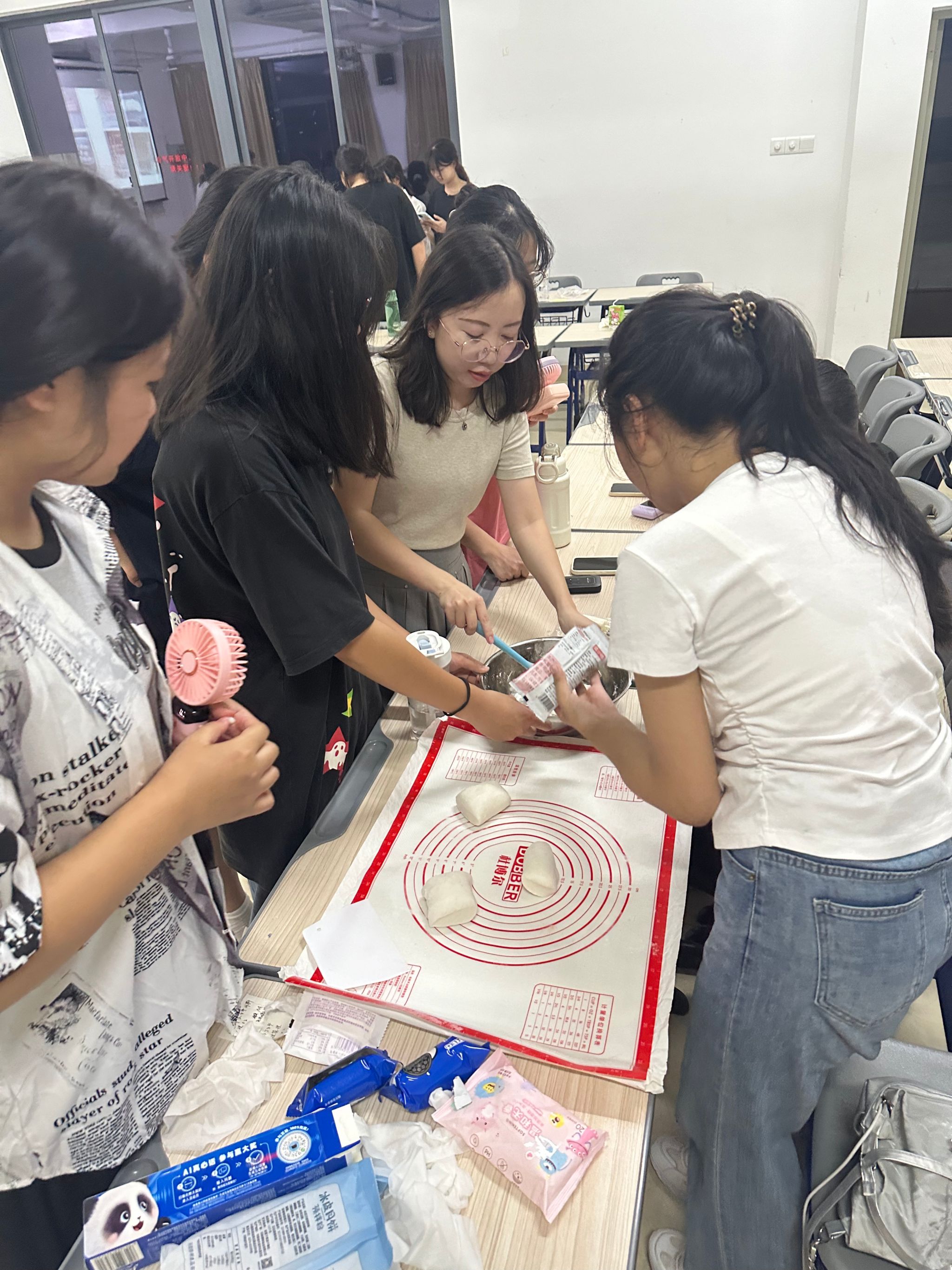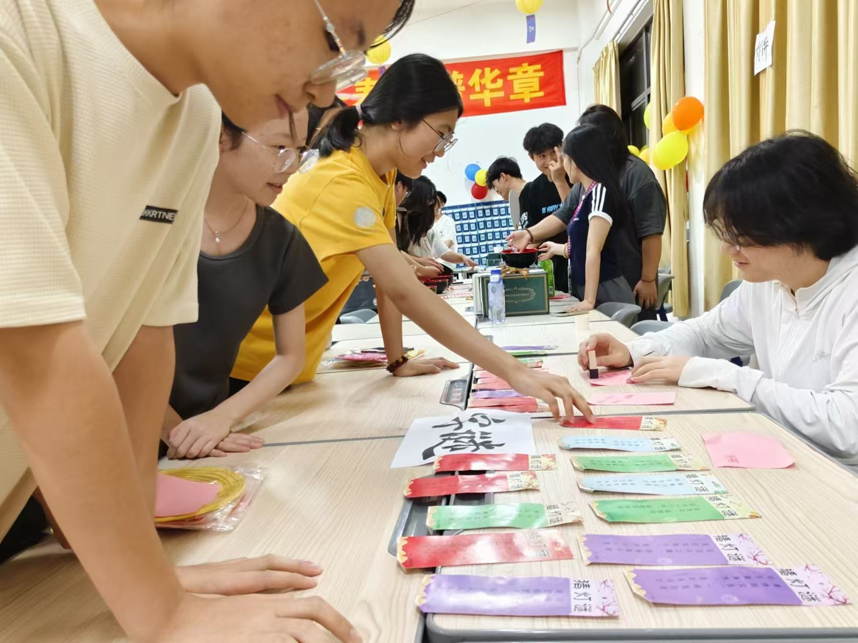 活动现场,同学们满怀激情,沉浸于猜灯谜、灯笼、漆扇制作、投壶竞技以及中秋寄语书写等一系列丰富多彩的文化活动中。猜灯谜区,一盏盏彩灯高挂,谜语或诙谐或深邃,激发了同学们的智慧火花,大家或低头沉思,或相视一笑,共赴这场智慧与乐趣的盛宴;漆扇制作环节,学生们亲手操作,每一步都凝聚着对传统手工艺的敬畏与热爱。这一过程不仅让学生们感受到了传统技艺的精湛与美妙,更在心灵深处种下了对非物质文化遗产认知与保护的种子,激发了他们传承与创新的责任感与使命感。此外,2024级新生们也举办了形式多样的班级中秋活动,各班级活动现场气氛温馨而融洽。在这个特殊的日子里,大家的心紧紧地连在了一起。