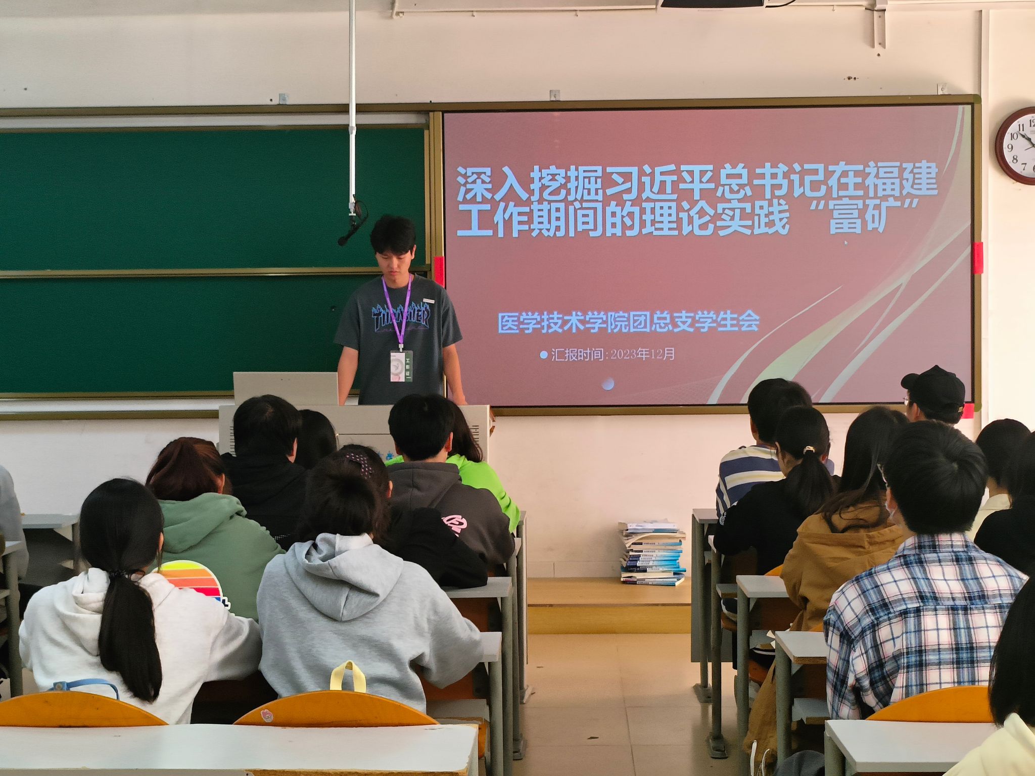 为推动学习贯彻习近平新时代中国特色社会主义思想主题教育走深走实,营造学生广泛参与、组织基本覆盖的浓厚氛围,12月18日,医学技术学院团总支学生会深入挖掘习近平总书记在福建工作期间的理论实践“富矿”,围绕“看书本、寻足迹,悟思想、育新人”,组织师生开展精读细研《闽山闽水物华新——习近平福建足迹》活动。本次活动在明德楼207举行,医学技术学院团总支学生全体学生参加。