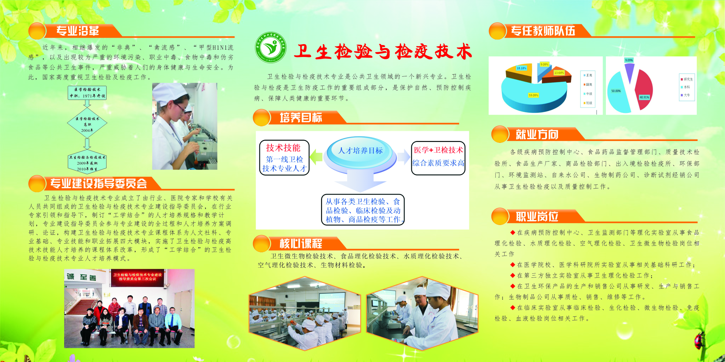 采用“标准融入、工学结合、校企共育、一专多证”的人才培养模式。主要培养服务于各类卫生食品生产加工企业、各级疾病控制、 卫生监督机构,能进行卫生检验、食品检验、农产品检验、商品检疫等工作的技术技能型人才。