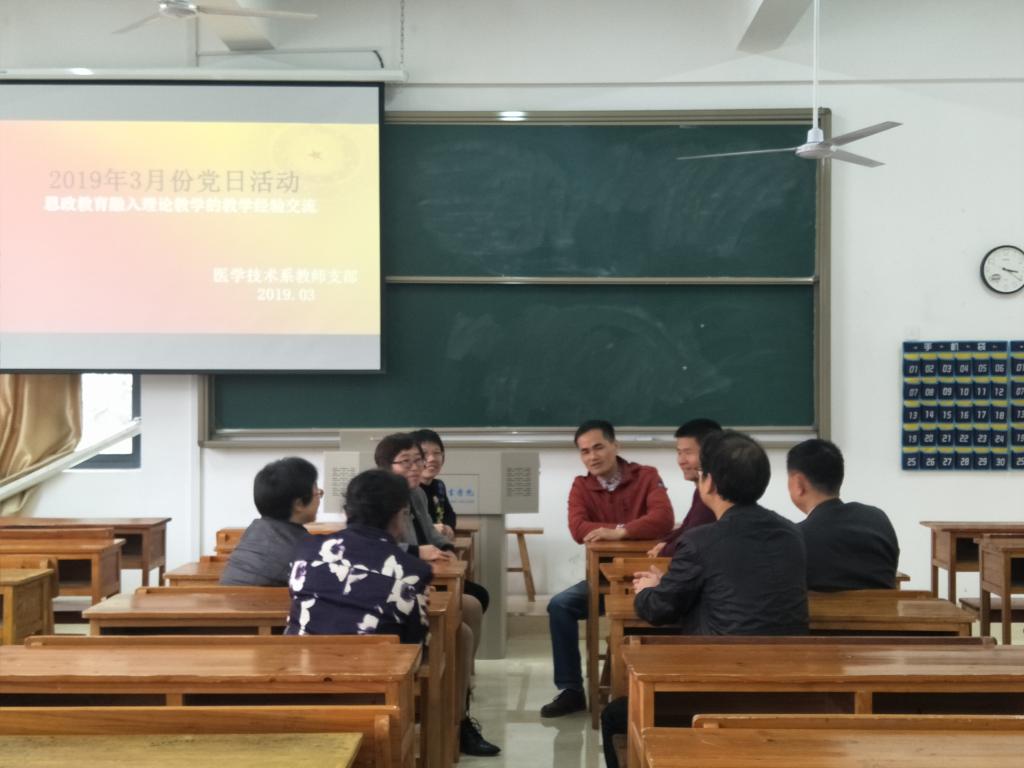 医学技术系教师支部于2019年3月29日在厚德楼104开展“将思政教育融入理论教学的教学经验”的党日活动,由教师支部书记陈雅静主持,支部全体党员踊跃发言,热烈互动。