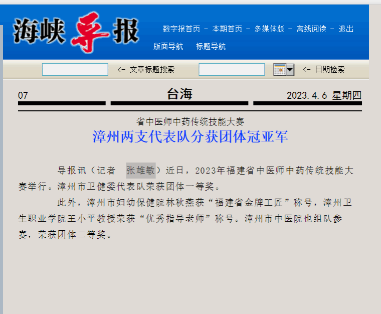 海峡导报:省中医师中药传统技能大赛 漳州两支代表队分获团体冠亚军