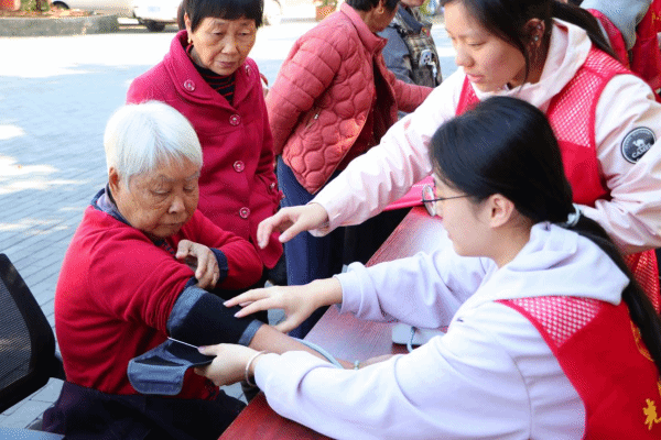 除了传统药材展示,师生们还准备了冬季养生药茶,用药食同源的理念向村民传递治未病的中医智慧。量血压服务台前,党员师生细心为村民测量并记录数据,提供个性化的养生建议;本草工坊内,大家在志愿者指导下亲手制作中药香囊,艾叶、厚朴、草果等药材的芬芳在现场弥漫。