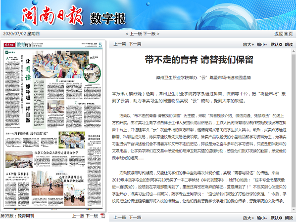 2020年7月2日,《闽南日报》发表题为《带不走的青春 请替我们保留——漳州卫生职业学院举办“云”跳蚤市场传递校园温情》文章。报道全文如下: