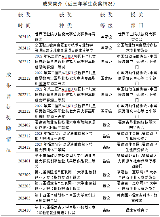 采用“标准融入、工学交替、校企共育”人才培养模式,与漳州市医院、中医院等深度合作,实施“4+1”工学交替教学(4学期在校学习+1学期临床实践),推行“1+X”主辅修制度(主修康复治疗技术,辅修运动康复或儿童康复),开展个性化跟岗学习(如吞咽言语治疗、运动康复方向)。通过“以赛促学、以赛促教”,学生近三年斩获世界职业院校技能大赛银奖、全国儿童康复职业技能大赛一等奖、福建省康复技能大赛二等奖、福建省运动促进健康知识竞赛一等奖及福建省创新创业大赛金奖等多项荣誉,毕业生以扎实技能和创新能力深受行业认可。