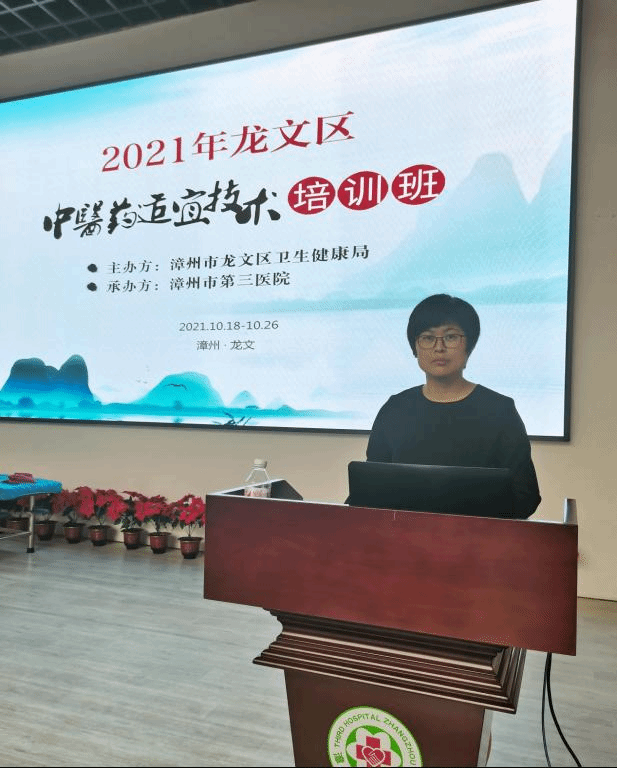 10月25日,我系教师党支部韩春雯博士受邀参加漳州市龙文区2021年基层中医药适宜技术培训班,并开展题为《穴位贴敷疗法》的讲座。