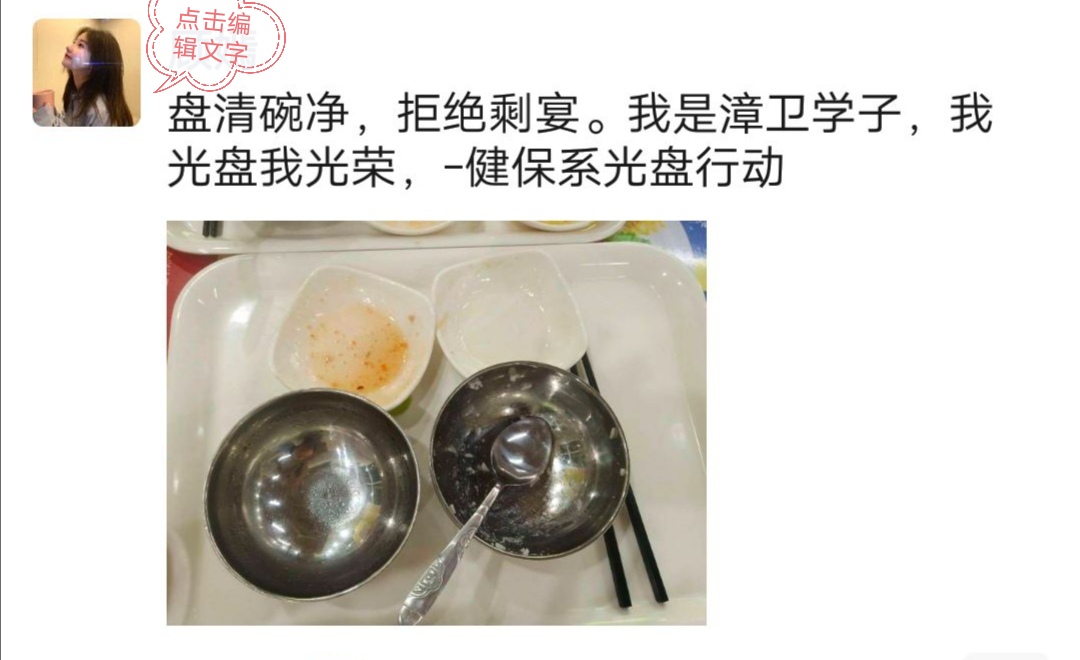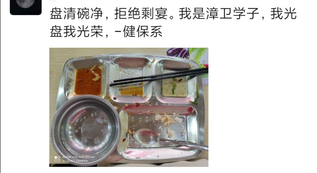 11月2日,为响应光盘行动,健康与保健系团总支学生会特开展“厉行节约,从我做起”光盘活动。向全体师生普及餐桌文明知识,推广餐桌文明礼仪,倡导节约用餐行为。