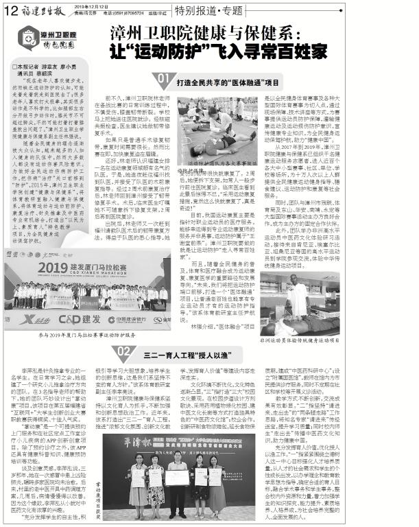 2019年12月12日,《福建卫生报》院校风采,专题特别报道了我院特色院系之健康与保健系:让“运动防护”飞入寻常百姓家。报道全文如下: