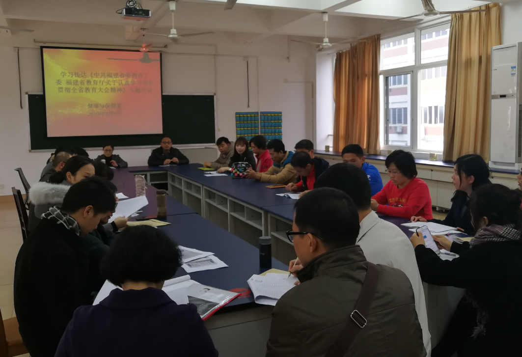 3月5日下午,健康与保健系在致贤楼301会议室召开全系教职工大会,学习传达《中共福建省委教育工委 福建省教育厅关于认真学习宣传贯彻全省教育大会精神》。会议由系党总支副书记周继峥主持。并结合教育工作和自身思考进行了重点导读。