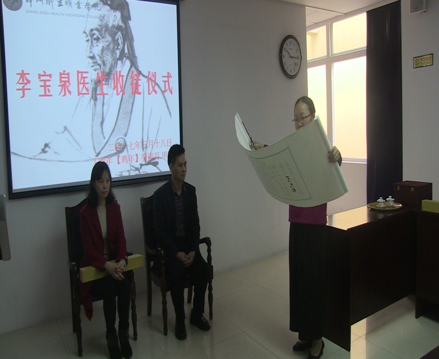 3月18日上午,我院健康与保健系专任教师蔡秋梅拜师李宝泉医师仪式在行政楼5楼会议室举行。仪式由健康与保健系副主任李淼主持,学院沈小美副院长、党工部蓝淑华部长、学院纪委陈义三副书记以及系部班子成员和教研室主任代表参加拜师仪式,校外嘉宾卢宗金、黄坤生、洪照宽等莅临见证。