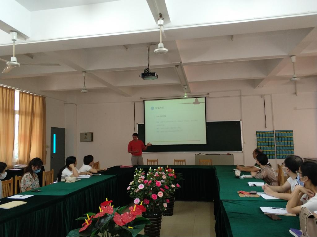本次培训课由我系专任教师黄煌老师主讲,内容主要涉及公务写作。黄煌老师曾在院办工作多年,文笔突出,文字工作经验丰富。针对我系教师普遍存在文笔较弱的情况,黄煌老师结合自身从事多年文字工作的经历,向大家传授宝贵的写作经验。他从公文写作格式、特点、要点,分门别类,娓娓道来,参与培训的老师,听得十分投入。