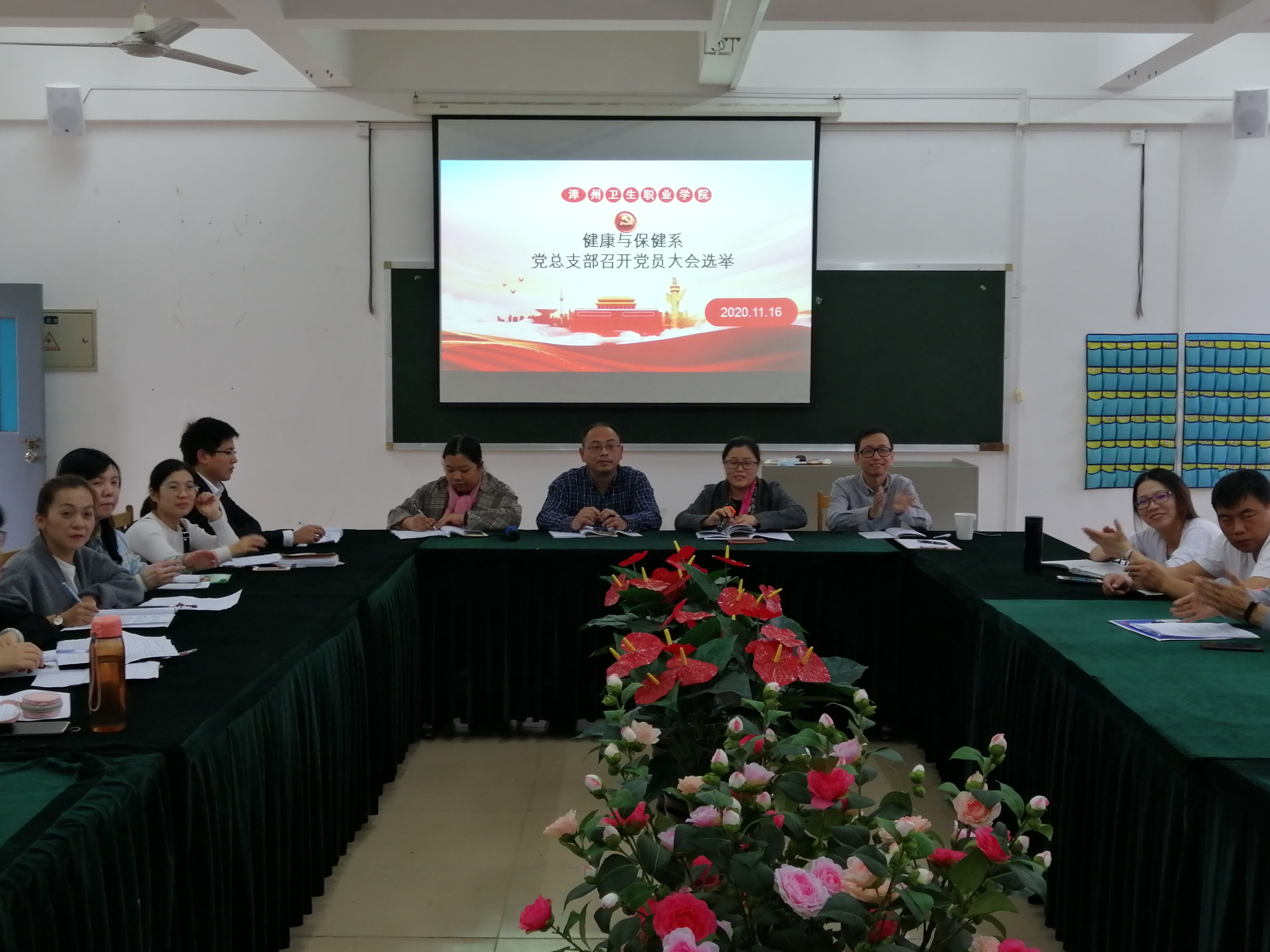 2020年11月16日下午,健康与保健系党总支于在致贤楼301召开中共漳州卫生职业学院健康与保健系总支部委员会换届选举大会,会议由本届党总支副书记周继峥主持,系部党员参加本次会议。