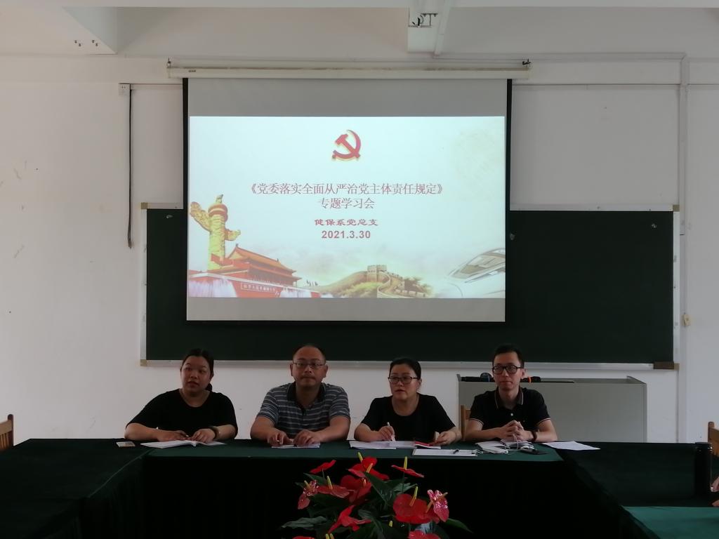 3月30日下午,健保系党总支副书记周继峥主持召开落实全面从严治党主体责任专题学习会议,健保系党总支全体委员参加会议,会议上专题学习中央办公厅近日印发的《党委(党组)落实全面从严治党主体责任规定》。