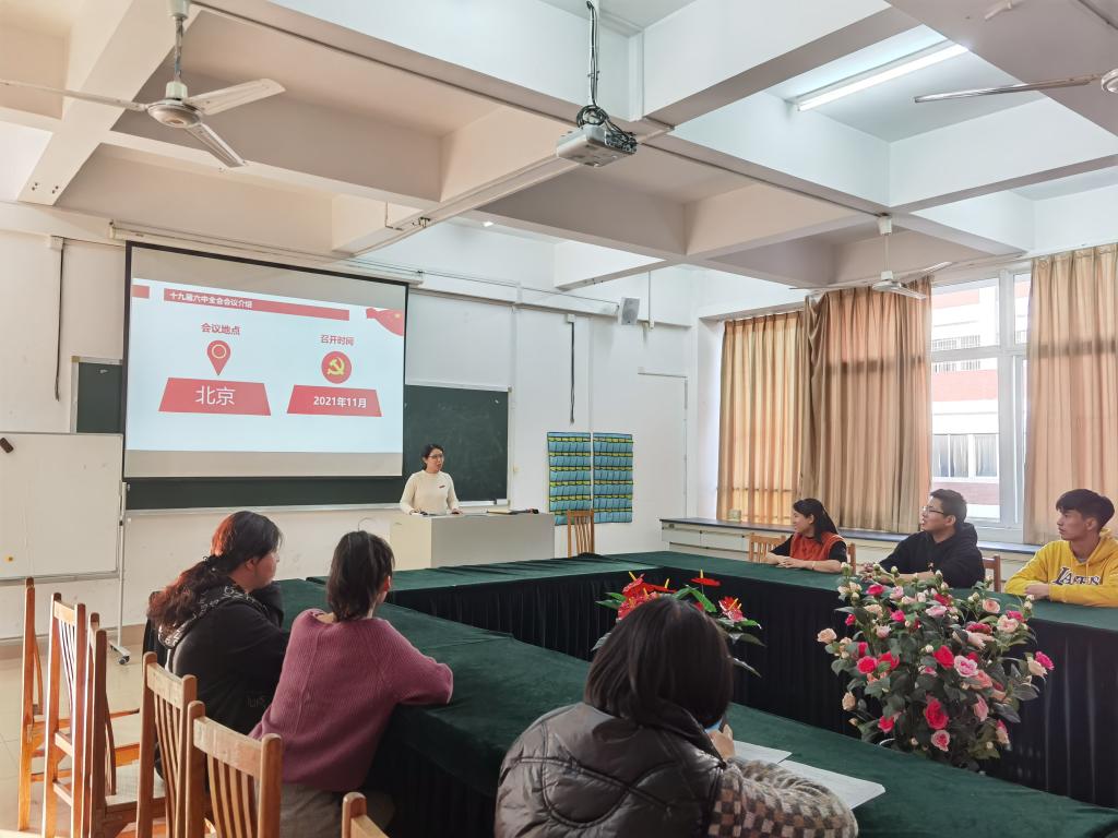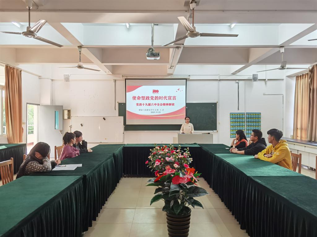 11月23日下午,健康与保健系学生党支部在致贤楼301开展十九届六中全会精神宣讲活动,主题为“使命型政党的时代宣言——党的十九届六中全会精神解读”,会议由支部书记主讲,支部全体党员参与。