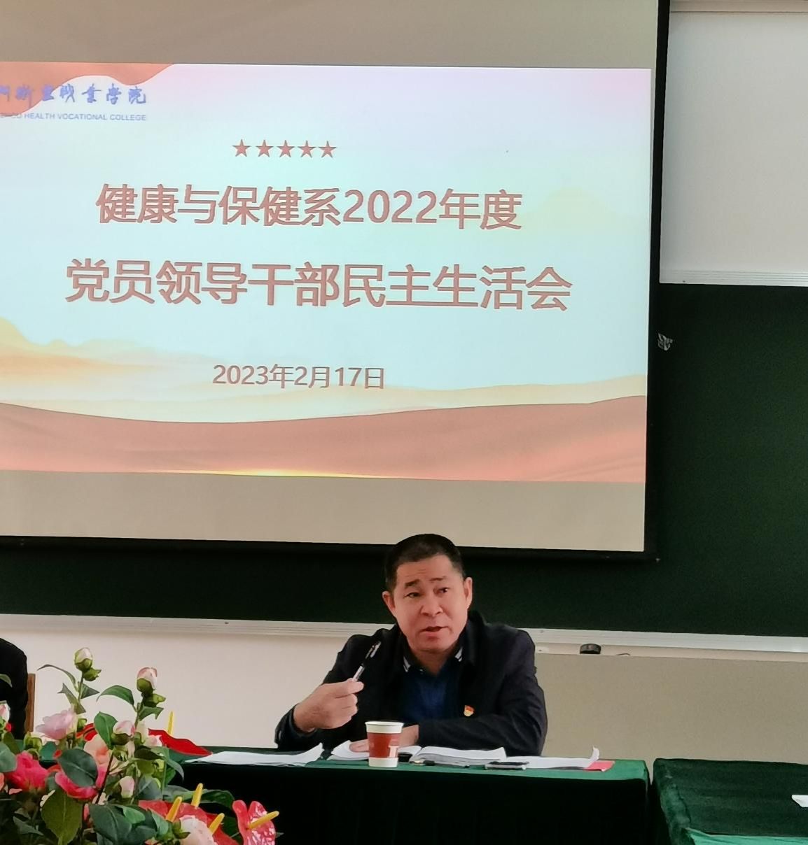 2月17日上午,健康与保健系党总支在致贤楼301召开2022年度党员领导干部民主生活会。学院党委委员、副院长陈义三到会指导,会议由党总支书记李国华主持。