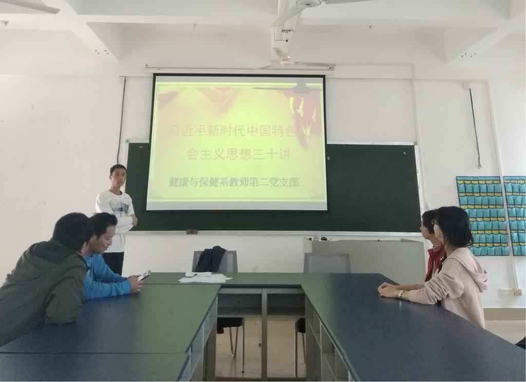 为进一步突出开展信念引领梦想教育,坚持以中国特色社会主义理论体系武装头脑、指导实践,引导广大干部群众不断增强道路自信、理论自信、制度自信,提高广大党员干部的思想觉悟。2018年12月18日,健康与保健系教师第二党支部决定开展学习《习近平新时代中国特色社会主义思想三十讲》主题党日活动。