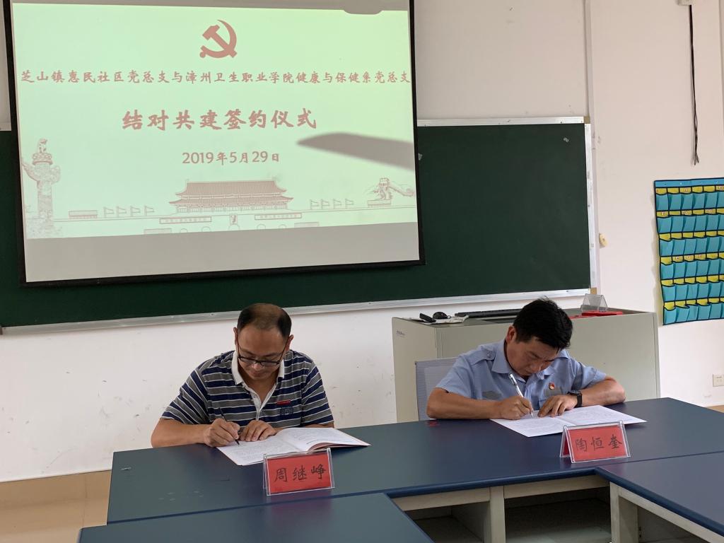 2019年5月29日上午,芝山镇惠民社区党支部与漳州卫生职业学院健康与保健系党总支合作共建活动在漳州卫生职业学院健康与保健系会议室举行。芝山镇组织委员张惠珊、惠民社区党支部书记陶恒奎及健康与保健系党总支副书记、辅导员和学生代表参加了此次活动。