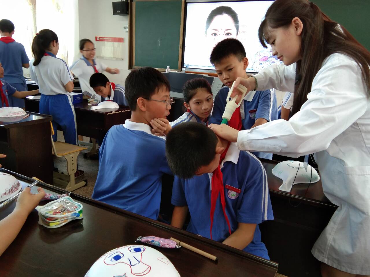 本次活动中共有三个环节。第一环节,小朋友们在志愿者的带领下,跟着学习脸部的一些穴位以及功能,小朋友们积极参与其中,互动现场气氛活跃。第二环节,志愿者就气罐的常见中医知识进行讲解,并手把手教小朋友们拔气罐,小朋友们在实际操作中,体验中医药的乐趣。第三环节,志愿者们介绍生活常见中草药及其功效、辨认方法,最后,志愿者们将事先做好的驱蚊香囊送小朋友们。现场的小朋友们纷纷表示这是别开生面的一堂课,首次接触中医药文化的他们,兴趣盎然,希望多多开展这样的活动。