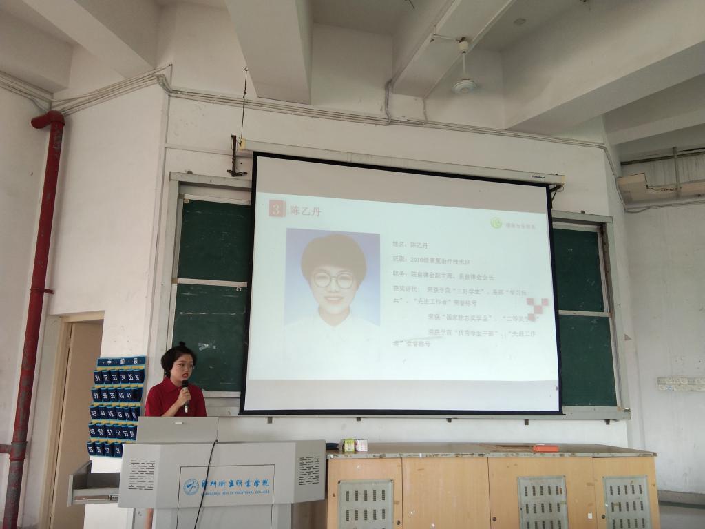 八位优秀学生代表结合自己的亲身经历,用质朴的语言和真挚的情感就自己的学习、学生工作、社会实践、实习情况等方面向在场的同学作了报告:2016级高职康复治疗技术班汤丽真同学作《别在最能吃苦的年纪选择安逸》事迹报告,2016级高职健康管理班陈淑慧同学作《不忘初心,砥砺前行》事迹报告,2016级高职康复治疗技术班柯张琴同学作《宝剑锋从磨砺出,梅花香自苦寒来》事迹报告,2016级高职卫生信息管理班蒋婉秀同学作《自强不息,厚德载物》事迹报告,2016级高职针灸推拿班周静同学作《毅力,永不言弃》事迹报告,2016级高职针灸推拿班沈锦容同学作《不忘初心,方得始终》事迹报告,2016级高职康复治疗技术班陈乙丹同学作《能力越大,责任越大》事迹报告,2016级高职康复治疗技术班陈雪芹同学作《生命不息 奋斗不止 不让你的大学留遗憾》先进事迹。每一个故事都充满真情实感,既再现了他们的成长,也触碰着我们的心灵,给予现场师生满满的正能量,现场掌声雷动。