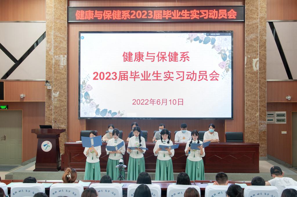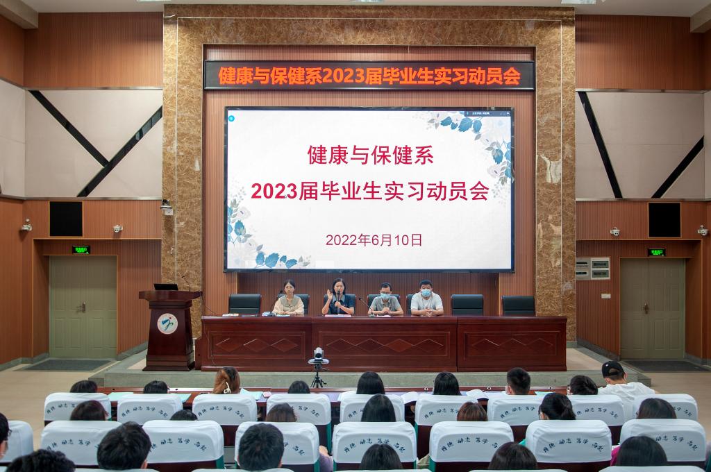 6月10日,健康与保健系在学术报告厅召开2023届毕业生实习动员大会,系部党政领导班子、实习班级辅导员及365名即将奔赴实习单位的实习生参加大会。大会由系总支副书记主持。