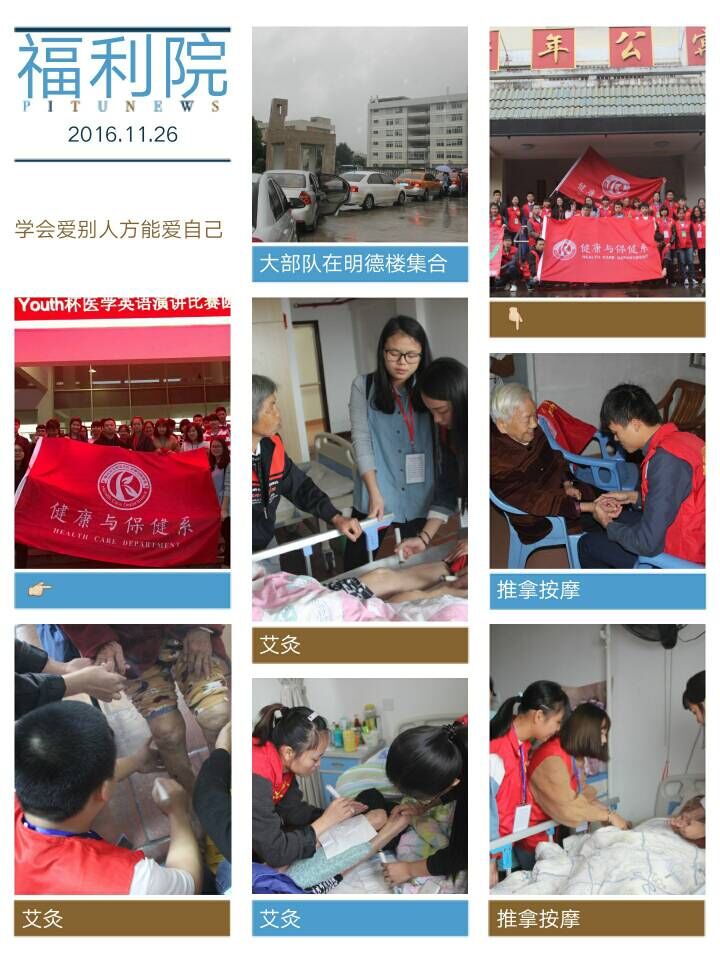 11月26日下午,漳州卫生职业学院健康与保健系团总支学生会组织了约30人的义诊服务队来到漳华福利院,开展主题为“敬老爱老”的志愿服务活动,在寒冷的冬天给福利院的老人们送去了一份关爱和温暖。